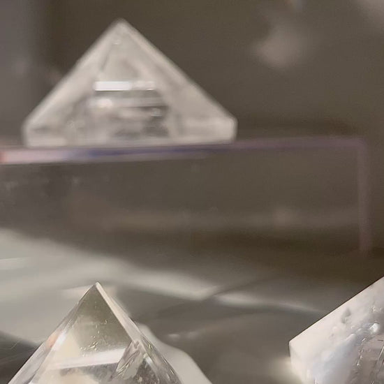 Hand-carved in a classic four-face pyramid formation, this clear quartz sculpture marries geometry with geology. Measuring 2 inches across, it’s cut from high-grade Brazilian quartz—known for its exceptional clarity and low inclusion rate.